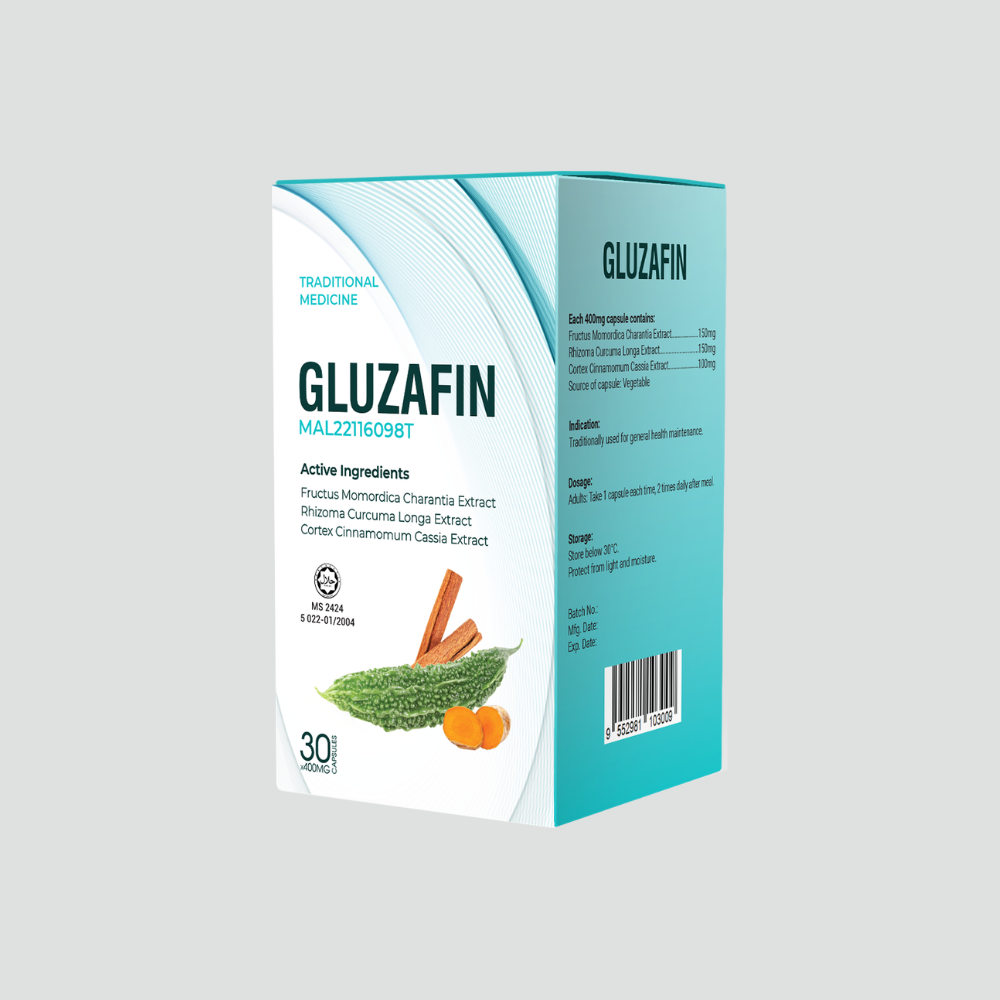Gluzafin merupakan kapsul suplemen yang diformulasikan dengan gabungan bahan terpilih yang lazim digunakan dalam produk sokongan metabolik. Ia membantu menyokong kawalan gula dalam darah dalam julat normal serta menyumbang kepada keseimbangan tenaga harian.
