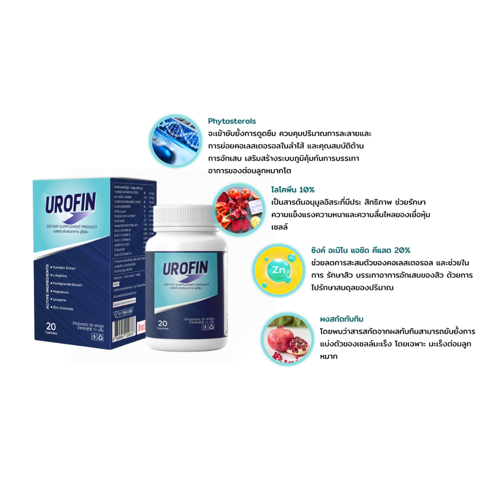 Urofin คือผลิตภัณฑ์เสริมอาหารชนิดแคปซูลที่ออกแบบมาสำหรับผู้ชายที่มีปัญหาเกี่ยวกับต่อมลูกหมาก ช่วยสนับสนุนการทำงานตามปกติของระบบทางเดินปัสสาวะและลดความไม่สบายตัว รูปแบบแคปซูลรับประทานง่ายและสะดวกต่อการใช้ในชีวิตประจำวัน
